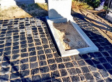 Замываем брусчатку и снимаем с надгробья защищающий надпись и фотокерамику скотч, протираем памятник от строительной пыли.